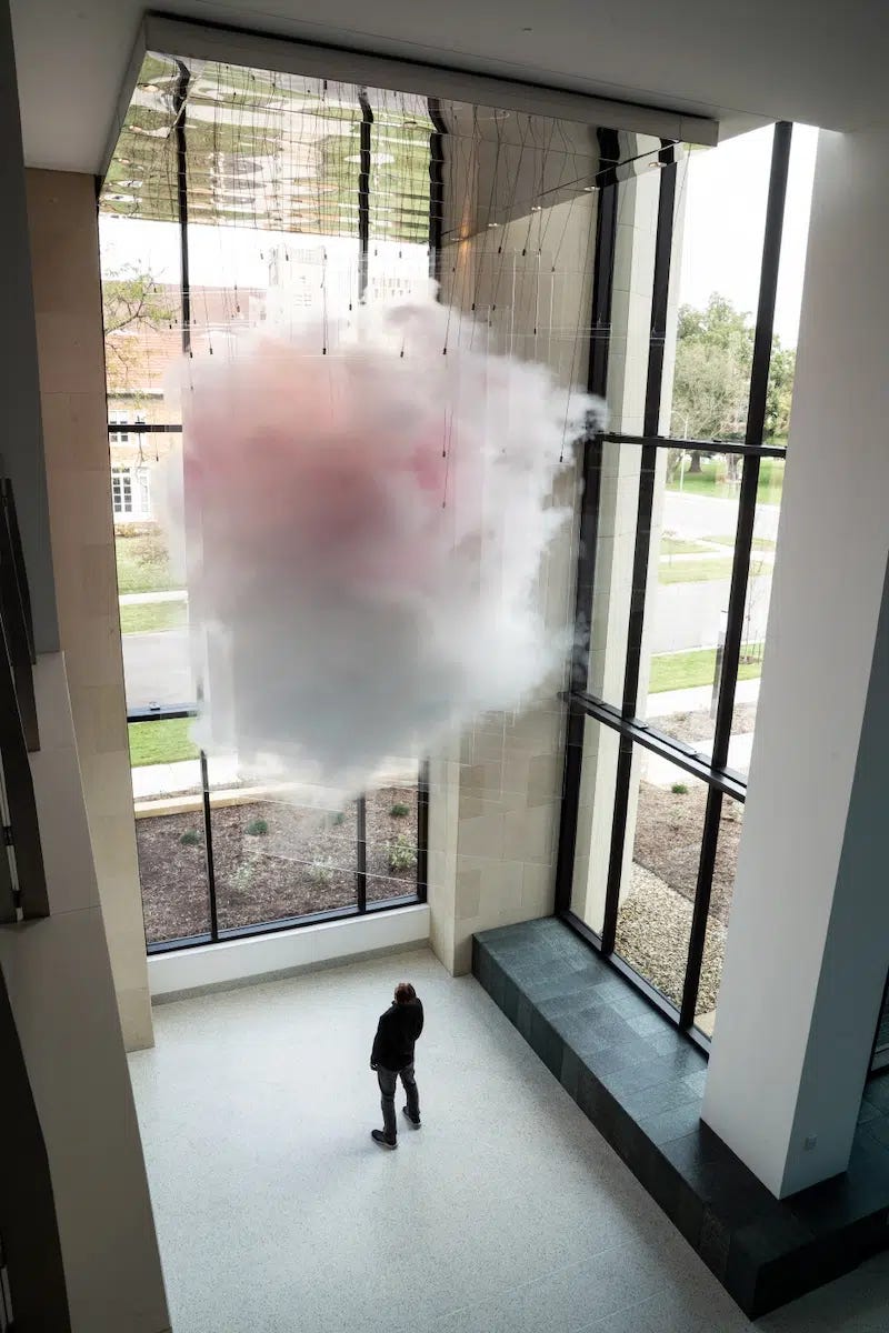 About a month and a half ago I drove to Topeka Kansas to check out David Spriggs work “Astra” that is in the Docking office building next to the state capital. The piece is made from layers of transparent planes. Each plane features a transparent printed image that are aligned in space to form a three-dimensional cloud shape that changes and shifts as you move around it. It’s an extremely impressive work.