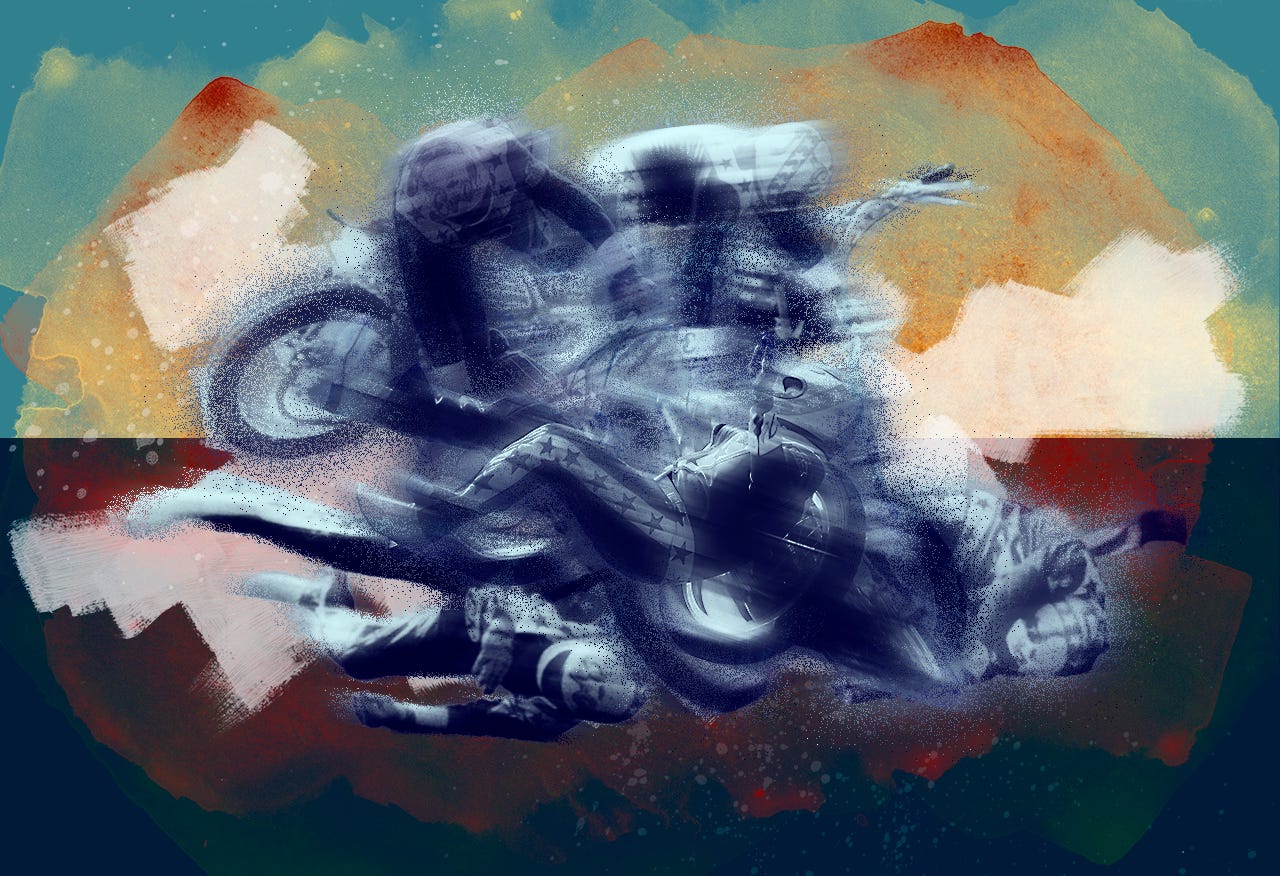 Anyway, after visiting the museum, I started working on a new series of composited images based on a sequence of Knievel crashing after hitting the 13th bus before the ramp at Wembley. There is something about the images of this man attempting to defy the odds and jump over 13 AEC Merlin buses. In many ways it feels like a metaphor to me for the state of the United States right now. Where the world watches as our current administration continues to do things that baffle the mind. Like a slow motion train wreck that none of us can look away from.